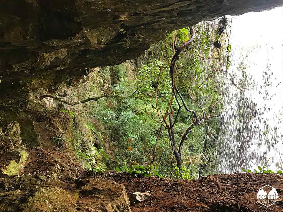 Ao final da rota ainda teremos uma trilha curta para uma cachoeira que possui uma linda gruta, onde é possível ver a queda d’água por trás! Quem sabe até um banho role!